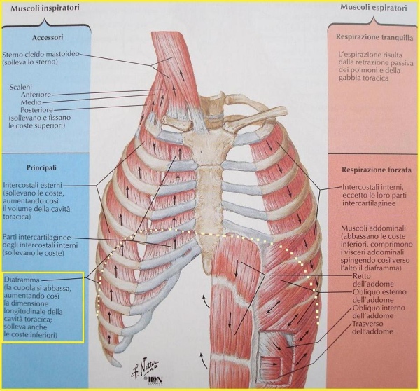 Il muscolo inspiratore principale è il DIAFRAMMA (voluminoso muscolo che separa l’addome dal torace), gli inspiratori accessori, che intervengono in condizione fisiologiche nella media e grande respirazione sono gli intercostali esterni, lo sternocleidomastoideo, gli scaleni anteriori, medi, posteriori, grande e piccolo pettorale, gran dentato, piccolo dentato, gran dorsale, trapezio, elevatori della scapola, romboideo, trasverso spinoso, lungo dorsale, sacro lombare e spino-spinoso.