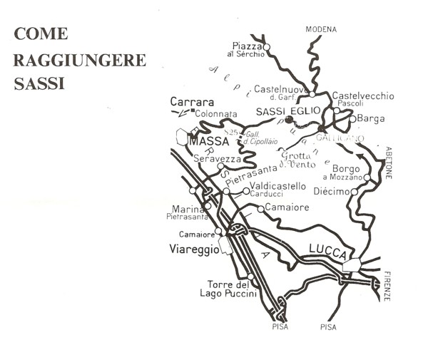 – da Lucca e dalla Mediavalle: S.S.1 dell’Abetone e del Brennero, seguire le indicazioni per Gallicano (o in assenza di queste, per Castelnuovo di Garfagnana), quindi per Molazzana; a questo punto seguire per Sassi – Eglio.