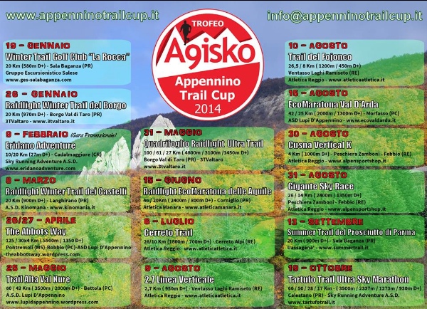 Il calendario del TROFEO AGISKO – Appennino Trail Cup: 16 gare che spaziano dal Vertical Kilometer all’Ultra-trail e toccano in modo trasversale l’Appennino Emiliano, dai crinali della Provincia di Piacenza passando per le province di Reggio Emilia e Parma.